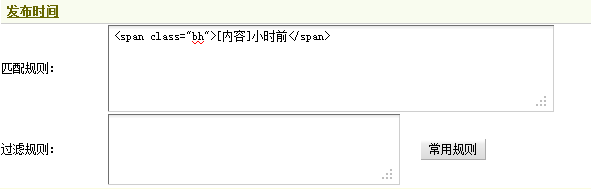 回到圖23,可發(fā)現(xiàn)有“17小時前”,由此可見,這里采集數(shù)字17就可以了。采集規(guī)則為“<span class=”bh”>[內(nèi)容]小時前</span>”。這里不需要使用過濾規(guī)則。填寫后,如圖30所示,