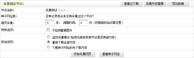 附加選項:此選項一共有3種采集模式可供選擇:第一種為“監(jiān)控采集模式(檢測當前或所有節(jié)點是否有新內容)”,選取后,系統(tǒng)只會采集指定節(jié)點中更新的內容;第二種為“重新下載全部內容”,選取后,系統(tǒng)會采集指定節(jié)點中的全部內容;第三種為“下載種子網站的未下載內容”,選取后,系統(tǒng)只會采集指定節(jié)點中未下載過的內容,包括以前沒下載的和更新的內容。