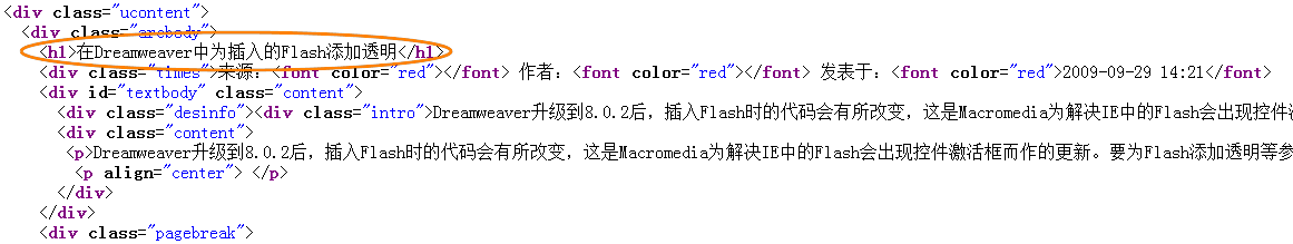 (a)回到正在打開的文章內容頁面的源代碼,找到文章內容的開始部分“Dreamweaver升級到8.0.2后”,如圖28所示,
