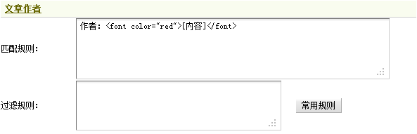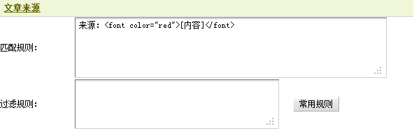 在上圖23中,可發(fā)現(xiàn)“來源:”二字后面有一組標簽“<font color=”red”></font>”,以此猜測,來源內容將會寫在這組標簽之間。與2.1.2處理方式相同,為了保持唯一性,文章來源的采集規(guī)則應為“來源:<font color=“red”>[內容]</font>“。同樣,這里也不需要使用過濾規(guī)則。填寫后,如圖26所示,