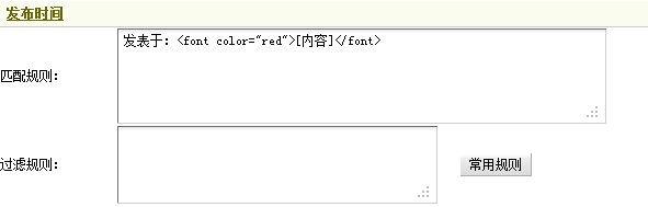 再次回到圖23,找到“發(fā)表于:”及其后的“<font color=”red”>2009-09-29 14:21</font>”,與之前獲取采集規(guī)則方法相同,此處應把“發(fā)表于: <font color=”red”>[內容]</font>”作為發(fā)布時間的采集規(guī)則。同樣,這里也不需要使用過濾規(guī)則。填寫后,如圖27所示,
