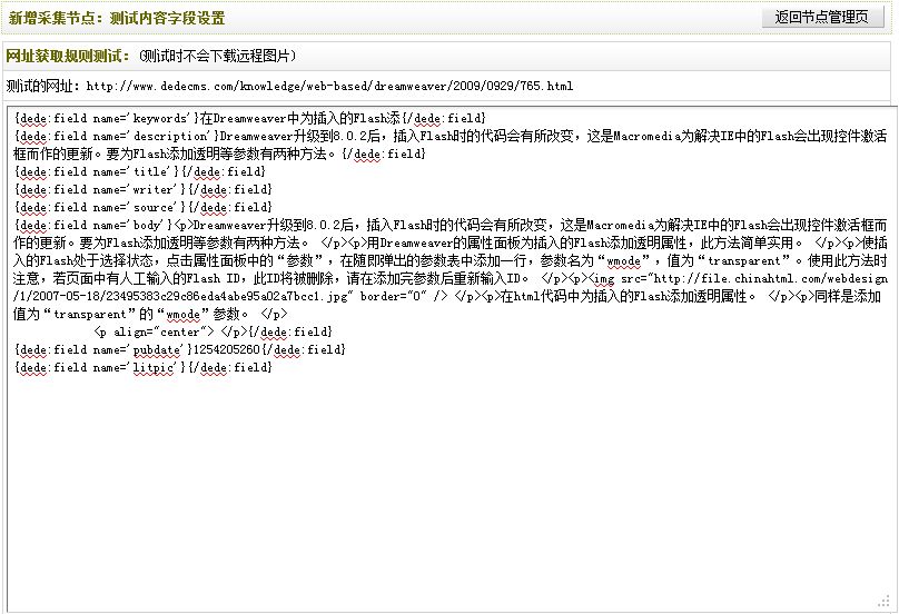 檢查無誤后,單擊“保存配置并預覽”。如果之前設置正確,單擊后,將會進入“新增采集節(jié)點:測試內容字段設置”頁面并看到相應的文章內容。如(圖33)所示,