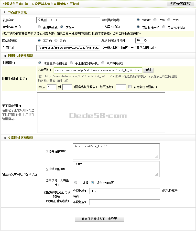 圖4-新增采集節(jié)點:第一步設置基本信息及網(wǎng)址索引頁規(guī)則