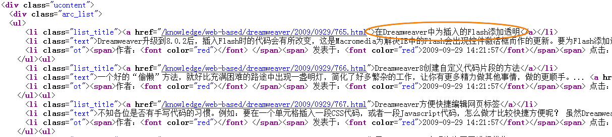 (a)對于“區(qū)域開始的HTML”,可通過在打開的文章列表首頁上,單擊右鍵后選擇“查看源文件”。在源文件中,找到第一篇文章的標題“在Dreamweaver中為插入的Flash添加透明”,如(圖17)所示,