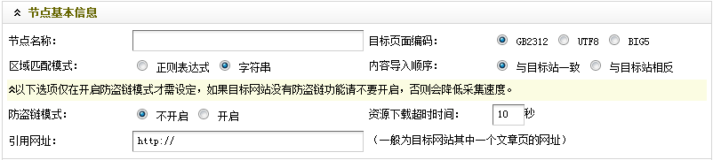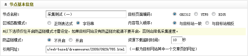 “區(qū)域匹配模式”:設定如何匹配所需采集的內容部分,可采用字符串或者正則表達式。系統(tǒng)默認的模式是字符串。如果比較了解正則表達式的朋友,可以在這里選擇正則表達式的模式。