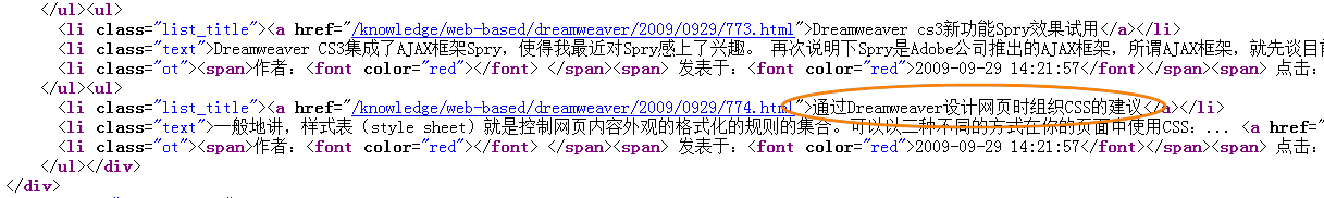 (b)在源文件中,找到最后一篇文章標題“通過Dreamweaver設計網(wǎng)頁時組織CSS的建議”,如(圖18)所示,
