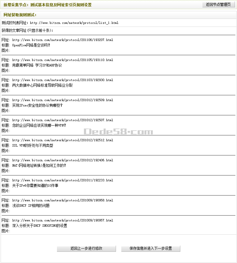 全部完成并檢查無誤后,單擊“保存信息并進(jìn)入下一步設(shè)置“。如果之前設(shè)置正確,單擊后,將會(huì)進(jìn)入“新增采集節(jié)點(diǎn):測(cè)試基本信息及網(wǎng)址索引頁規(guī)則設(shè)置的網(wǎng)址獲取規(guī)則測(cè)試”頁面并看到相應(yīng)的文章列表地址。如(圖13)所示,