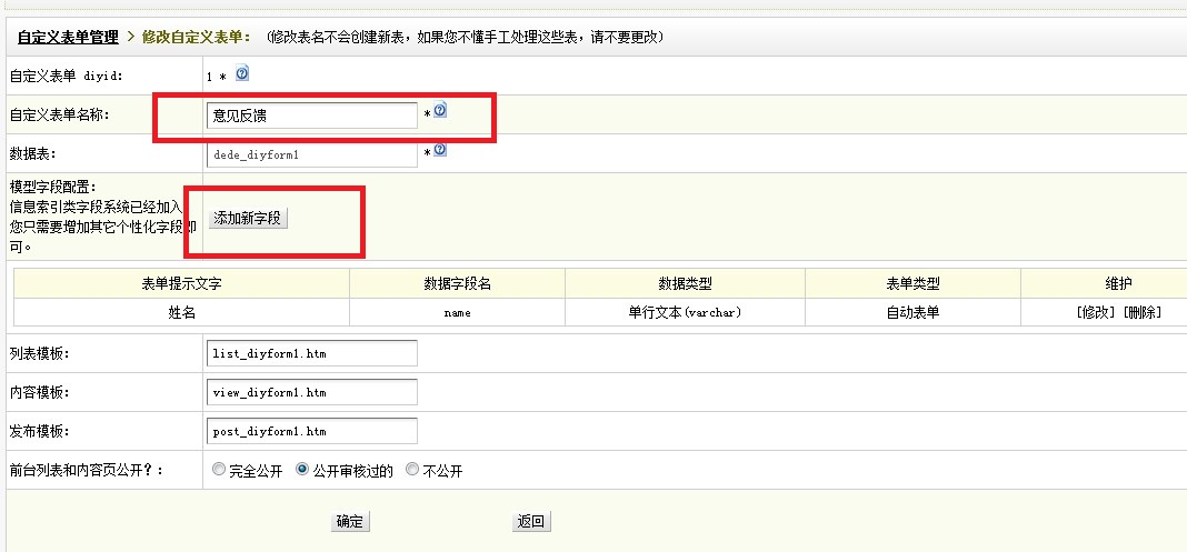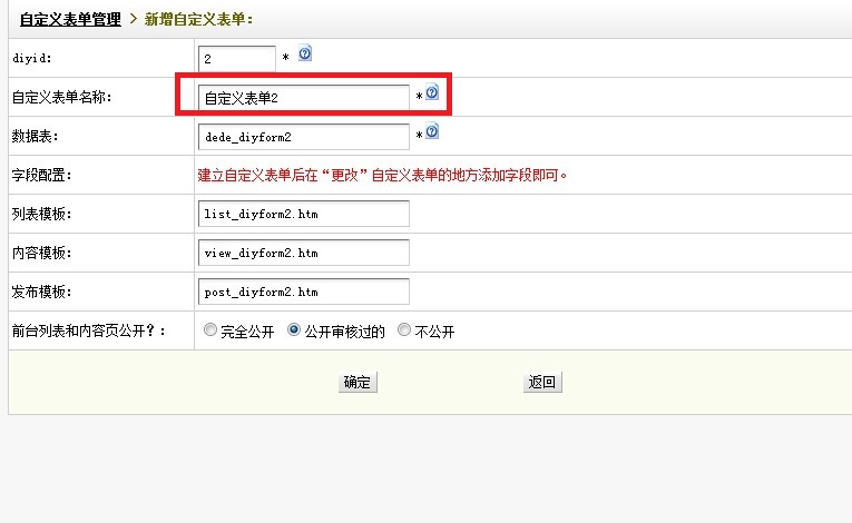 'dede_diyform1' 是你要調用的表的名稱 [field:dosxp/] 是你添加的表的字段名稱 要想無需審核 提交之后立刻顯示 在增加新表單的“前臺列表和內容頁公開?:”選項選擇“完全公開”