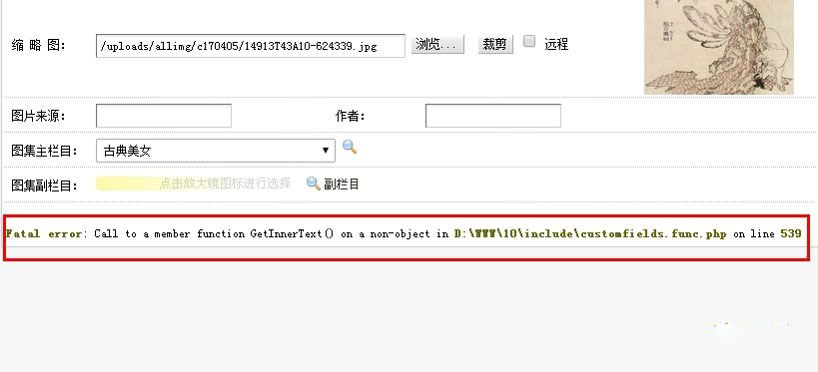 織夢(mèng)修改或者添加了自定義字段為圖片或者添加自定義表單后在后臺(tái)修改文章的時(shí)候出現(xiàn)如下錯(cuò)誤:Fatal error: Call to a member function GetInnerText() on a non-object in \include\customfields.func.php on line 539