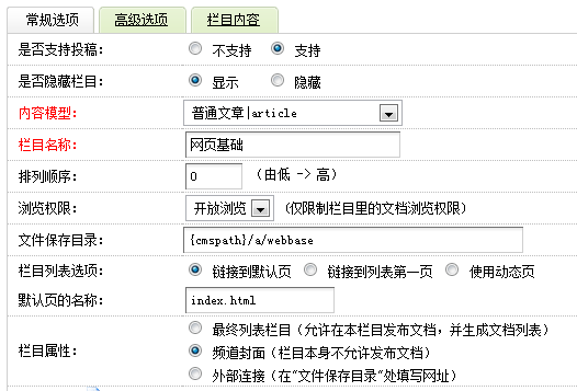 點擊更改??吹匠R?guī)選項中欄目屬性是最終列表欄目,點高級選項,就能看到文檔模板為{style}/article_article.htm,所以Html欄目下所有的文章都會以這個模板顯示。