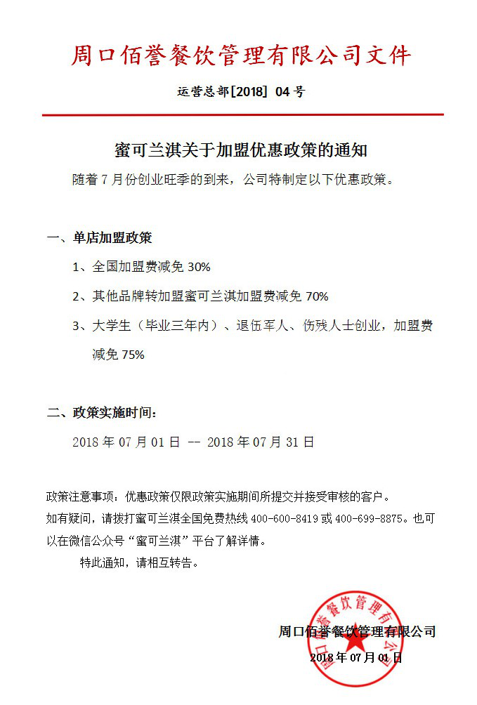 創(chuàng)業(yè)時(shí)代逐夢而來,2018年7月1日—31日期間,蜜可蘭淇推出單店加盟優(yōu)惠風(fēng)暴:全國加盟費(fèi)減免30%,其他品牌轉(zhuǎn)加盟蜜可蘭淇加盟費(fèi)減免70%,大學(xué)生(畢業(yè)三年內(nèi))、退伍軍人、傷殘人士創(chuàng)業(yè),加盟費(fèi)減免75%。這些貼心的政策,讓創(chuàng)業(yè)變得觸手可及,讓成功之路更加順暢。