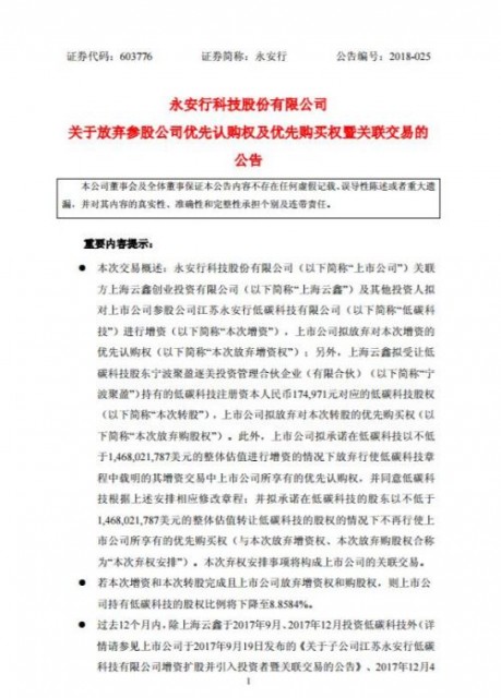 《永安行科技股份有限公司關于放棄參股公司優(yōu)先認購權及優(yōu)先購買權暨關聯(lián)交易的公告》顯示,上海云鑫將以永安行低碳14.68億美元的整體估值增資20億元人民幣并受讓另一家機構股東部分股票,上市公司永安行則放棄對本次增資的優(yōu)先認購權。