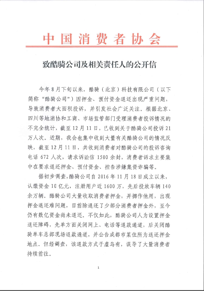 站長之家(Chinaz.com) 12 月 12 日消息 本年 8 月份,酷騎共享單車被曝出押金退還難的問題,至今仍有數(shù)億資金尚未退還。為此,中國消費(fèi)者協(xié)會(huì)今日發(fā)布《致酷騎公司及相關(guān)責(zé)任人的公開信》,要求酷騎公司對有關(guān)問題作出說明,并接受有關(guān)部門調(diào)查取證。