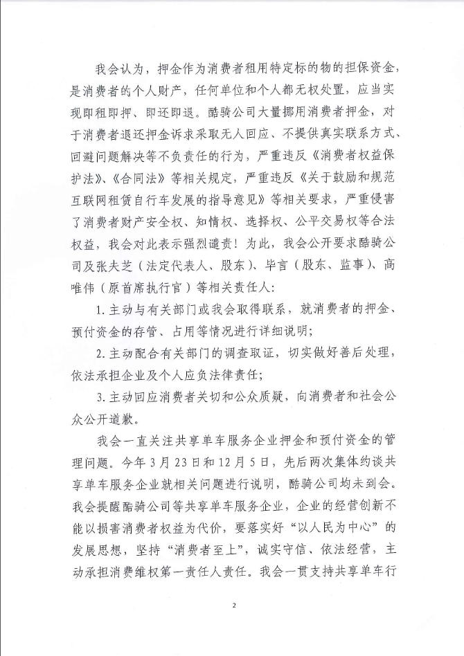 中消協(xié)對酷騎公司及有關(guān)負(fù)責(zé)人作出了如下要求