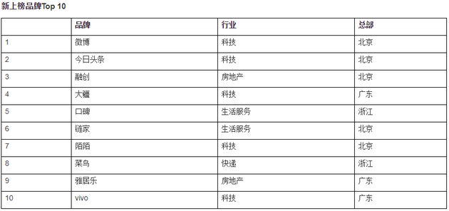 《 2017 胡潤品牌榜》 200 強中, 162 個品牌的品牌價值比去年有所增長, 24 個品牌首次上榜,其中微博的品牌價值在新上榜品牌中排名第一。