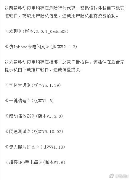 國家計(jì)算機(jī)病毒應(yīng)急處理中心近期通過對互聯(lián)網(wǎng)監(jiān)測,發(fā)現(xiàn) 8 款違法有害移動(dòng)應(yīng)用存在于移動(dòng)應(yīng)用發(fā)布平臺中,,其主要危害涉及隱私竊取和流氓行為兩類。如果你手機(jī)里有《一鍵清理》、《網(wǎng)速測試》、《超亮LED手電筒》等應(yīng)用。