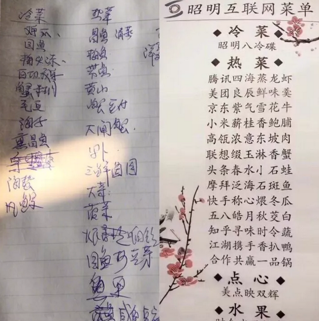 本年的烏鎮(zhèn)飯局,有兩張菜單引發(fā)了討論。一張是丁磊的手寫家鄉(xiāng)菜菜單,另一張則是把出席伙伴全部寫入菜名的東興局菜單。