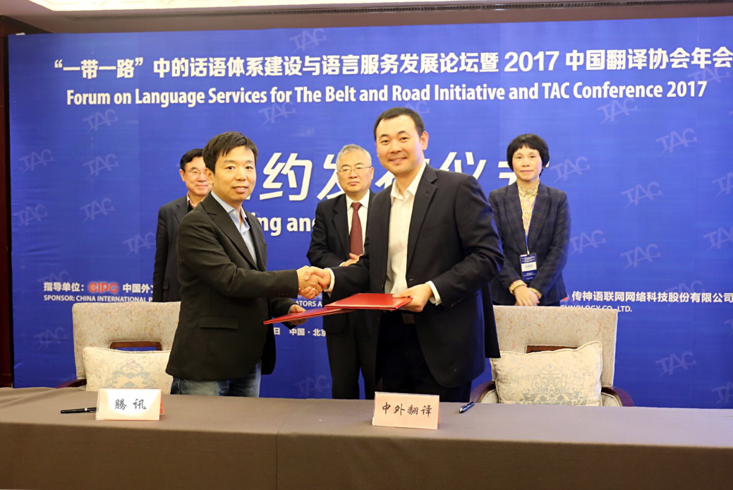 12 月1- 2 日,“一帶一路”中的話語(yǔ)體系建設(shè)與語(yǔ)言辦事發(fā)展論壇暨 2017 中國(guó)翻譯協(xié)會(huì)年會(huì)在北京舉行,國(guó)務(wù)院新聞辦、中國(guó)外文局、中國(guó)翻譯協(xié)會(huì)、中國(guó)翻譯研究院、商務(wù)部國(guó)際貿(mào)易經(jīng)濟(jì)合作研究院、國(guó)際翻譯家聯(lián)盟等機(jī)構(gòu)領(lǐng)導(dǎo)出席。騰訊翻譯君、中外翻譯公司在會(huì)議現(xiàn)場(chǎng)達(dá)成戰(zhàn)略合作伙伴關(guān)系,騰訊翻譯君副總經(jīng)理李學(xué)朝、中外翻譯咨詢有限公司總經(jīng)理顧巨凡別離代表雙方簽署戰(zhàn)略合作協(xié)議。