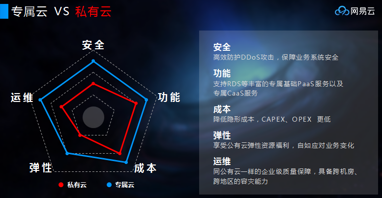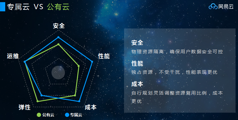 網(wǎng)易云專屬云是網(wǎng)易云于本年7月份云創(chuàng)大會上推出的創(chuàng)新性云計算模式,相當于在公有云上的私有云:企業(yè)用戶在網(wǎng)易云公有云上獨享物理隔離專屬區(qū),用戶可以使用與公有云相同的 IaaS、PaaS、CaaS 辦事,擁有與公有云相近的SLA,無需考慮資源運維和平臺運維。