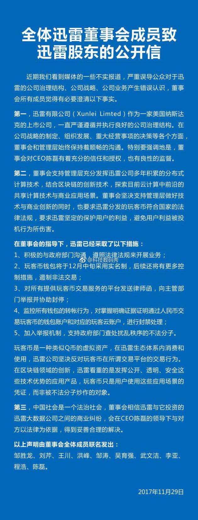 以下為全體迅雷董事會(huì)成員致迅雷股東信原文: