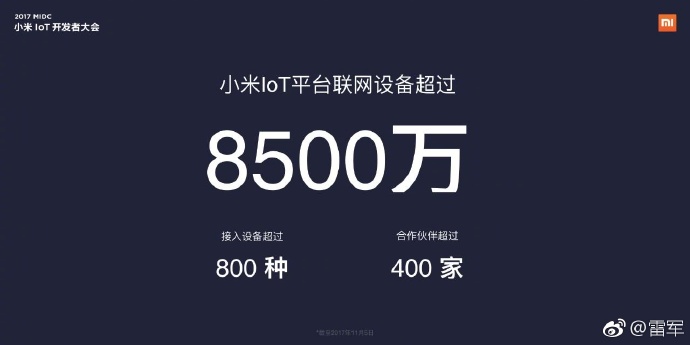 站長之家(Chinaz.com) 11 月 28 日消息 今日,小米正式舉行了小米IoT開發(fā)者大會,雷軍在會上宣布小米IoT平臺已接入 400 家合作伙伴的 800 多種智能設(shè)備,聯(lián)網(wǎng)設(shè)備數(shù)超過 8500 萬臺,已成為全球最大的智能硬件IoT平臺。