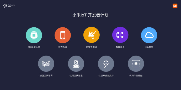 官方還表示,小米IoT開發(fā)者計劃將提供全方位扶持,包括初創(chuàng)團隊培育計劃,開發(fā)者免費申領(lǐng)開發(fā)板;優(yōu)秀團隊基金計劃,出資提供小米IoT基金;認證軟件開發(fā)商計劃,幫助大家篩選小米IoT平臺認證的外部第三方團隊;開發(fā)者補貼計劃,對產(chǎn)品持續(xù)跟蹤并提供平臺補貼等等。