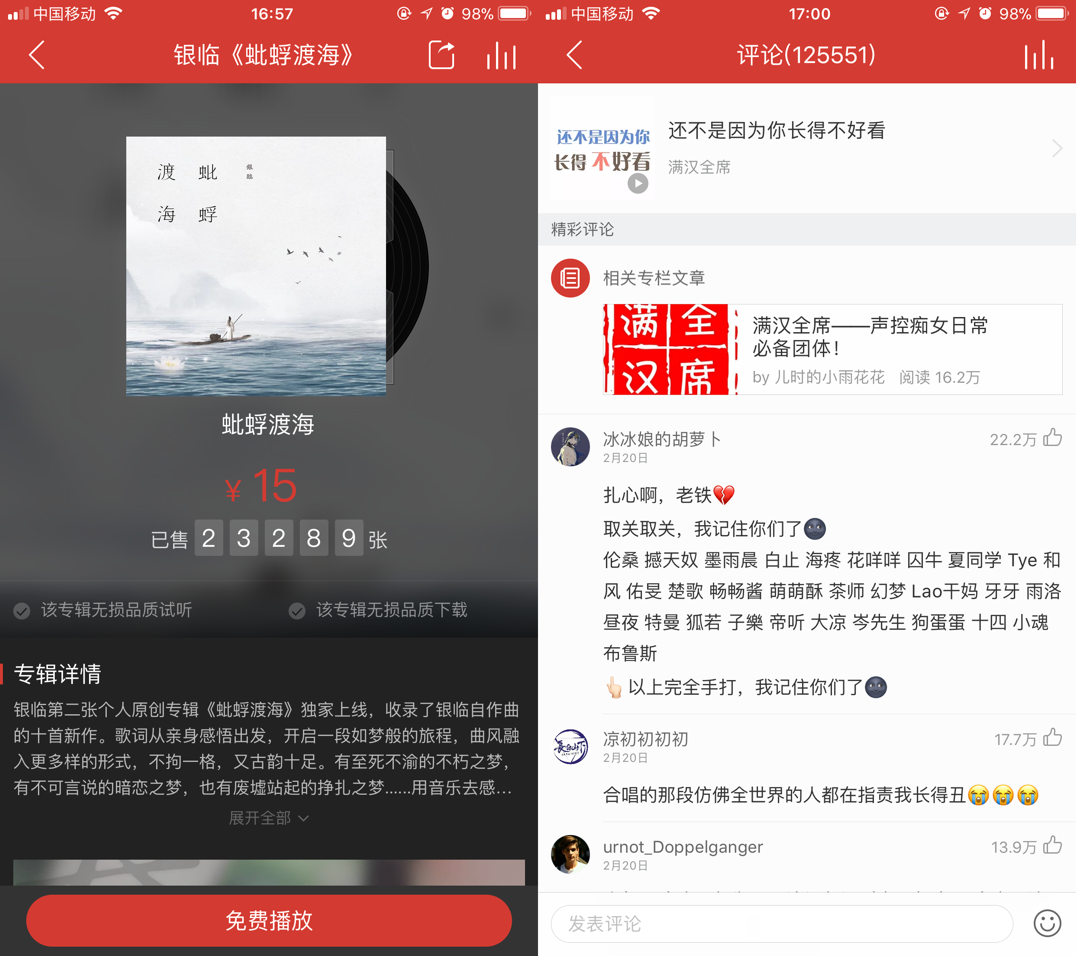同樣,在互聯(lián)網(wǎng)音樂平臺上,國風(fēng)音樂的表示也十分突出。按照網(wǎng)易云音樂后臺數(shù)據(jù)顯示, 2016 年全年網(wǎng)易云音樂上國風(fēng)音樂的播放量同比增長374%,而像河圖、音頻怪物、HITA、蕭憶情、滿漢全席、銀臨等國風(fēng)音樂人,在網(wǎng)易云音樂上也都擁有很高的人氣。滿漢全席的熱門歌曲《還不是因為你長得欠好看》,在網(wǎng)易云音樂上評論數(shù)超過12萬,而銀臨15元/張的數(shù)字專輯《蚍蜉渡?!?,在網(wǎng)易云音樂售出23289張,無論從樂評數(shù)量還是銷售數(shù)字而言,都是令人振奮的成績。