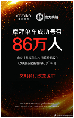 11月 21 日,摩拜單車挑戰(zhàn)并申報(bào)了一項(xiàng)吉尼斯世界紀(jì)錄:?jiǎn)我换顒?dòng)收到的最多宣誓。用戶通過(guò)摩拜單車微信小程序即可參與響應(yīng)《共享單車文明停放倡議》,一起完成挑戰(zhàn)吉尼斯世界紀(jì)錄稱號(hào)活動(dòng)。按照摩拜官方微博披露的海報(bào)看,摩拜用戶僅用半天即完成了此次吉尼斯世界紀(jì)錄稱號(hào)的挑戰(zhàn)。