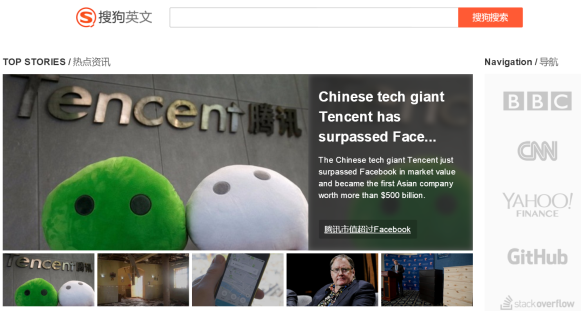 打開(kāi)搜狗英文搜索頻道,首先看到的即是熱點(diǎn)資訊版塊。該版塊每天更新五條全球最熱門新聞資訊,涉及政治、軍事、科技、娛樂(lè)、人文等差別領(lǐng)域,讓你第一時(shí)間獲知全球重大新聞。如,騰訊市值超過(guò)Facebook、尼日利亞自殺式襲擊事件等最新爆出的熱門新聞,就登上了搜狗英文搜索的“頭條”。而如果用戶對(duì)某條資訊感興趣,想進(jìn)一步閱讀了解,只需點(diǎn)擊相應(yīng)新聞的縮略圖即可直接跳轉(zhuǎn)至搜索結(jié)果頁(yè),從搜狗英文搜索提供的海量搜索結(jié)果中選擇閱讀關(guān)于該事件的更多信息。