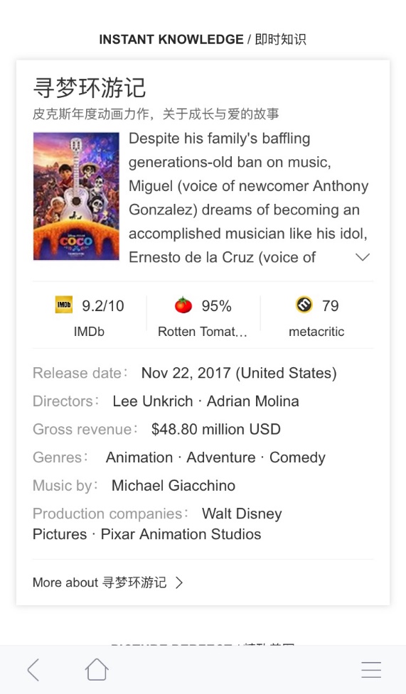 (圖:即時(shí)知識(shí)版塊對(duì)《尋夢(mèng)環(huán)游記》的全面介紹)