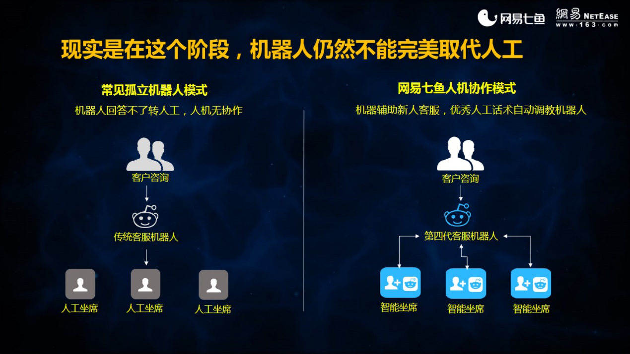 在當(dāng)下這個階段,機器人仍不能完美替代人工,,但在網(wǎng)易七魚人機協(xié)作模式下,機器人和客服之間能夠通過高效協(xié)作來提升辦事效率。此外,基于“一觸即達(dá)”的辦事模式,將會把辦事從單純的解答問題、解決問題,進(jìn)化到為用戶提供有溫度、個性化的辦事。
