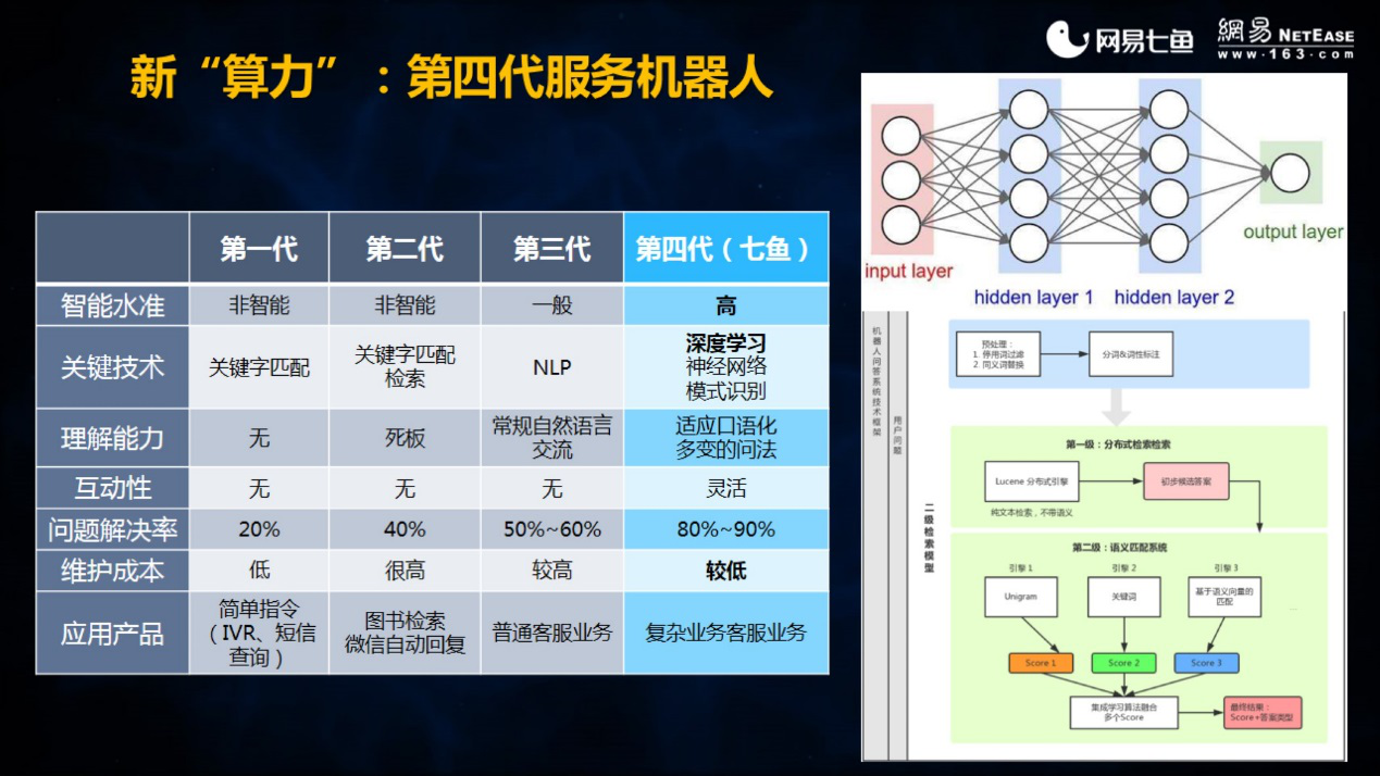 據(jù)張統(tǒng)剛不雅觀察,在當(dāng)前消費升級的時代配景下,辦事成為企業(yè)競爭的重要制勝因素,而決定辦事品質(zhì)的關(guān)鍵點在于辦事效果的快速直達(dá)。對此,網(wǎng)易七魚基于行業(yè)現(xiàn)狀提出了一個新的理念,即辦事領(lǐng)域的“算力”。在辦事行業(yè),基礎(chǔ) “算力”的發(fā)展往往建立在辦事外包、團(tuán)隊擴張等等舉措上,現(xiàn)在,新的辦事“算力”可以依托于網(wǎng)易七魚第四代智能客服機器人,用深度學(xué)習(xí)、神經(jīng)網(wǎng)絡(luò)等關(guān)鍵技術(shù)實現(xiàn)高問題解決率。