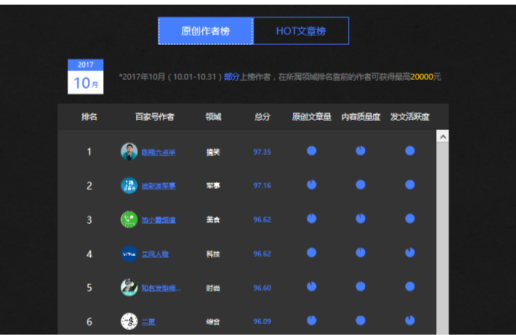10月原創(chuàng)作者榜是“百+計劃”升級后發(fā)布的第一期榜單,由百家號平臺從入圍優(yōu)質(zhì)作者的“原創(chuàng)優(yōu)質(zhì)文章量、內(nèi)容質(zhì)量度、活躍度、首發(fā)占比”等多重維度進(jìn)行綜合評選而出。
