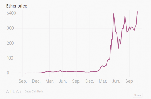 【TechWeb報(bào)道】 11 月 24 日消息,據(jù)美國(guó)財(cái)經(jīng)媒體Quartz報(bào)道,比特幣(Bitcoin)并不是唯一連結(jié)強(qiáng)勢(shì)增長(zhǎng)的加密貨幣,因?yàn)橐蕴?Ethereum)剛剛突破了 400 美元的關(guān)口,創(chuàng)下了歷史新高。