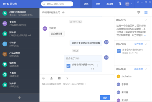 除了共同撰寫(xiě)和編纂文檔,WPS云協(xié)作還能按照企業(yè)組織架構(gòu)為每個(gè)部門(mén)自動(dòng)創(chuàng)建聊天群組,團(tuán)隊(duì)成員除了可在群組里直接發(fā)起群聊外,還能發(fā)起一對(duì)一私聊。聊天窗口不但可以發(fā)起協(xié)作文檔,還可以邊溝通邊記錄要點(diǎn)。