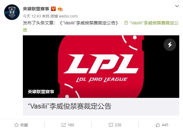 今中午,英雄聯(lián)盟賽事官微公布了對“Vasilii”李威俊禁賽的裁定公告,李威俊受到禁賽 20 個角逐月的處罰,也就是到 2020 年 1 月的第一賽季開始為止。