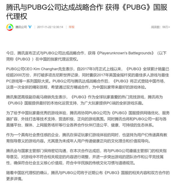 11 月 22 日上午,騰訊官方微博正式頒布頒發(fā)與 PUGB 公司達(dá)成戰(zhàn)略合作,獲得《PUBG》(Playerunknown's Battlegrounds,國內(nèi)代理中文名不決)中國獨(dú)家代理運(yùn)營(yíng)權(quán)。經(jīng)過漫長(zhǎng)的等待,這款本年最炙手可熱的游戲,終于能「名正言順」地出現(xiàn)在中國玩家面前。