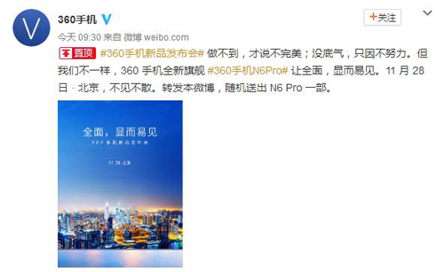 Pro,并預告在本周二會有更多消息。今日一早, 360 手機正式發(fā)出邀請函,頒布頒發(fā)將于 11 月 28 日在北京中國電影導演中心召開新品發(fā)布會,如無不測,即將表態(tài)的新品極有可能就是前幾日曝光的 360 手機N6