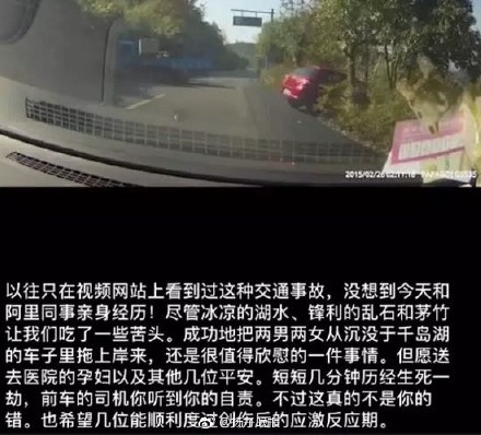 近日,阿里巴巴員工劉新停驅車前往千島湖,途中目擊一場交通變亂,一輛紅色小車被皮卡撞下山坡沖入千島湖。千鈞一發(fā)之際,劉新停沒有猶豫就半沖帶跑地跳入酷寒的湖中,迅速將車中兩男兩女拉上岸,其中還包孕一名孕婦,幾分鐘后車子沉入千島湖。確認 4 人沒事之后,劉新停繼續(xù)上路,按原計劃趕去吃魚頭。