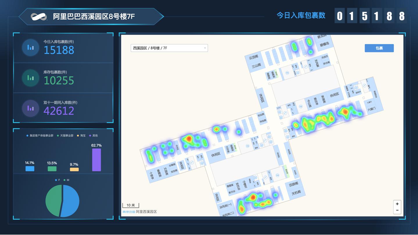 包裹熱力圖是阿里巴巴信息平臺(tái)本年雙 11 期間,為園區(qū)快遞辦理所研發(fā)的智能空間辦理圖示。頁面會(huì)顯示出園區(qū)每一層樓的包裹情況。哪個(gè)部門“剁手”最多,哪棟樓的小郵局最忙,一目了然。辦理人員還可以通過這張物流熱力圖實(shí)時(shí)了解整個(gè)園區(qū)入庫包裹和庫存包裹數(shù)量,便利他們快速科學(xué)地進(jìn)行包裹辦理和取件引導(dǎo)。