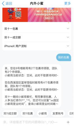 想快速知道本身有多少包裹已到達(dá)園區(qū),現(xiàn)在不消再去翻購物記錄或取件驗(yàn)證碼也能馬上實(shí)現(xiàn)。員工只需要向表里小蜜發(fā)送關(guān)鍵詞,它就會(huì)馬上告訴你有多少快遞到達(dá)了園區(qū),以及具體位置。而且快遞辦事點(diǎn)的忙閑狀態(tài)也能實(shí)時(shí)顯示哦。