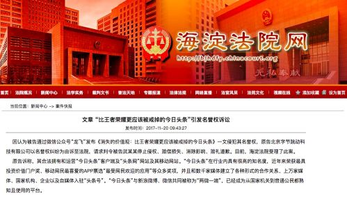 【TechWeb報(bào)道】 11 月 20 日消息,據(jù)海淀法院網(wǎng)消息,因認(rèn)為自媒體“龍飛”所發(fā)布的一篇名為《消失的價(jià)值不雅觀:比王者榮耀更應(yīng)該被戒掉的今日頭條》的文章侵犯其名譽(yù)權(quán),北京字節(jié)跳動(dòng)科技有限公司以名譽(yù)權(quán)糾紛為由訴至法院,請求判令被告武某某停止侵權(quán)、補(bǔ)償損失、消除影響、賠禮報(bào)歉。目前,海淀法院受理了此案。