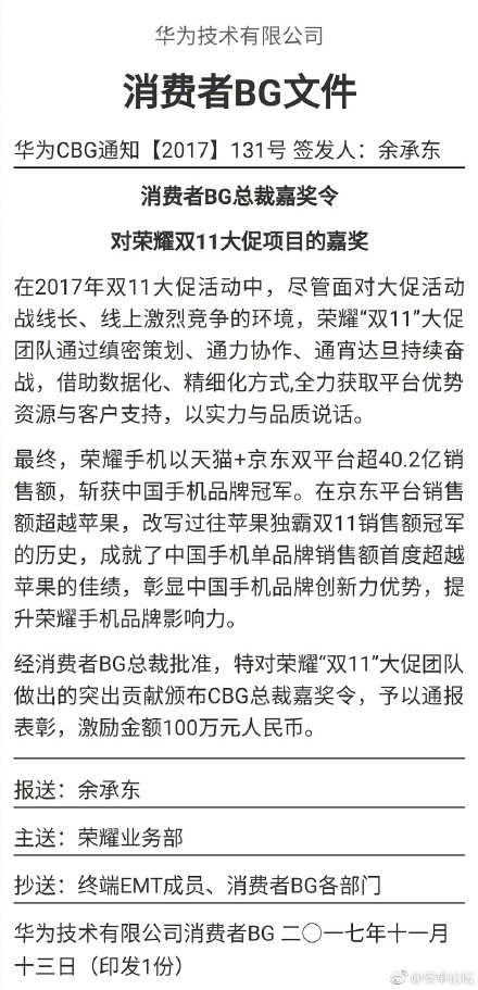 巨人網(wǎng)絡(luò)通訊聲明:本文標(biāo)題《余承東簽署嘉獎(jiǎng)令:獎(jiǎng)勵(lì)榮耀雙 11 大促團(tuán)隊(duì) 100 萬元》,本文關(guān)鍵詞 余承東,簽署,嘉獎(jiǎng)令,獎(jiǎng)勵(lì),;如發(fā)現(xiàn)本文內(nèi)容存在版權(quán)問題,煩請(qǐng)?zhí)峁┫嚓P(guān)信息告之我們,我們將及時(shí)溝通與處理。本站內(nèi)容系統(tǒng)采集于網(wǎng)絡(luò),涉及言論、版權(quán)與本站無關(guān)。