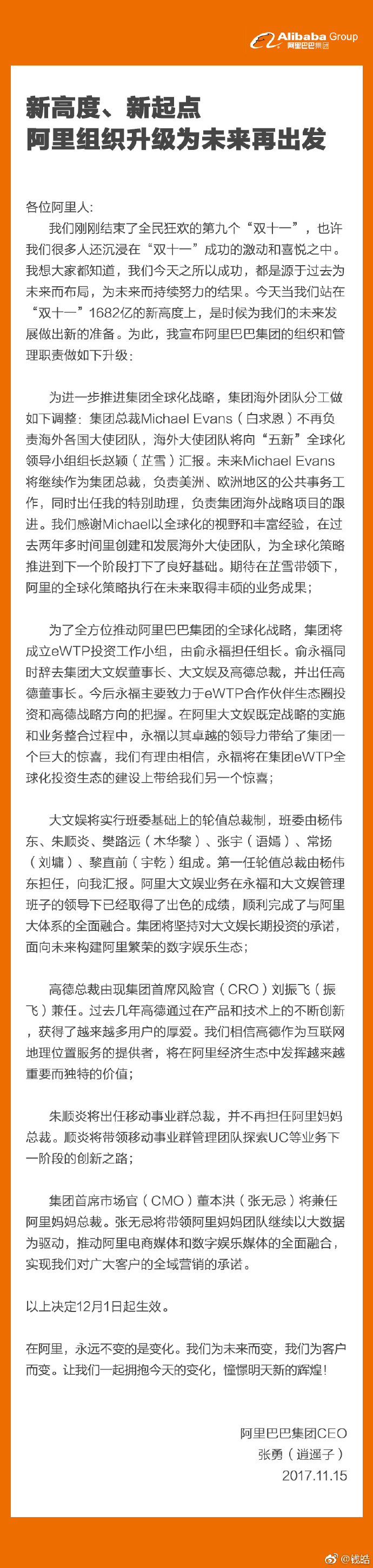 巨人網(wǎng)絡(luò)通訊聲明:本文標(biāo)題《俞永福辭任阿里大文娛董事長,出任eWTP投資小組組長》,本文關(guān)鍵詞 俞,永福,辭任,阿里,大,文娛,;如發(fā)現(xiàn)本文內(nèi)容存在版權(quán)問題,煩請?zhí)峁┫嚓P(guān)信息告之我們,我們將及時溝通與處理。本站內(nèi)容系統(tǒng)采集于網(wǎng)絡(luò),涉及言論、版權(quán)與本站無關(guān)。