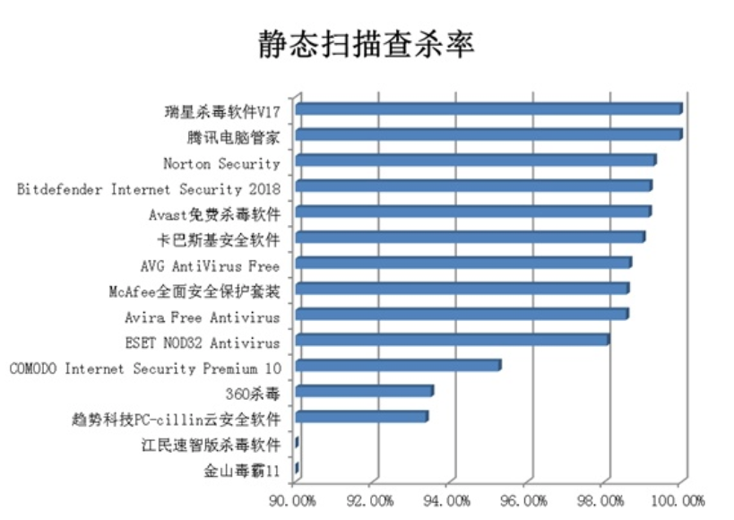 本次測試項(xiàng)目分為“靜態(tài)掃描”和“動(dòng)態(tài)測試”兩類。其中靜態(tài)掃描測試中,瑞星殺毒軟件和騰訊電腦管家以99.95%的查殺率共列榜首,賽門鐵克Norton Security和Bitdefender Internet Security2018 別離以99.28%、99.17%的查殺率名列第二和第三名。