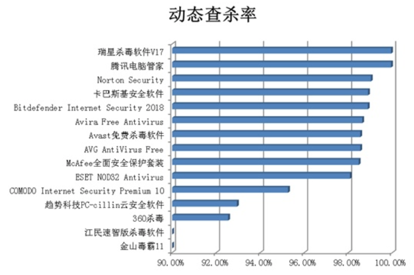 在動(dòng)態(tài)測試中,瑞星殺毒軟件和騰訊電腦管家表示依然領(lǐng)先,以99.94%的查殺率并列第一,賽門鐵克Norton Security以99.02%的查殺率獲得第二名,卡巴斯基安適軟件和Bitdefender Internet Security2018 別離以98.89%及98.88%的查殺率位列第三和第四名。