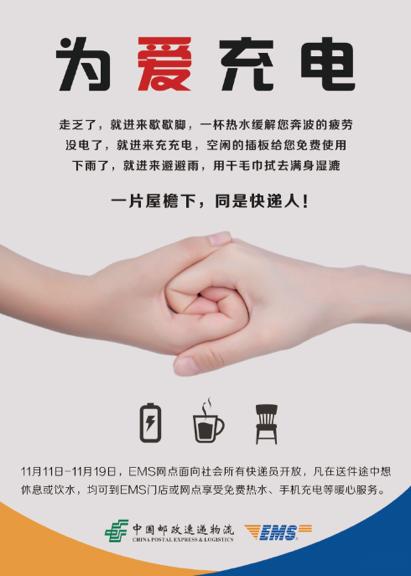 這一次,郵政EMS為雙十一注入了一股暖流?!盀閻鄢潆姟笔撬麄儼l(fā)出的愛心倡議!雙十一期間面向所有同行快遞小哥開放全國營業(yè)網(wǎng)點(diǎn),無論是哪家的快遞員,走乏了,就進(jìn)來坐一坐,一杯熱水緩解奔忙的疲憊;沒電了,就進(jìn)來充充電,空閑的插板可以免費(fèi)使用;心累了,就進(jìn)來聊一聊。