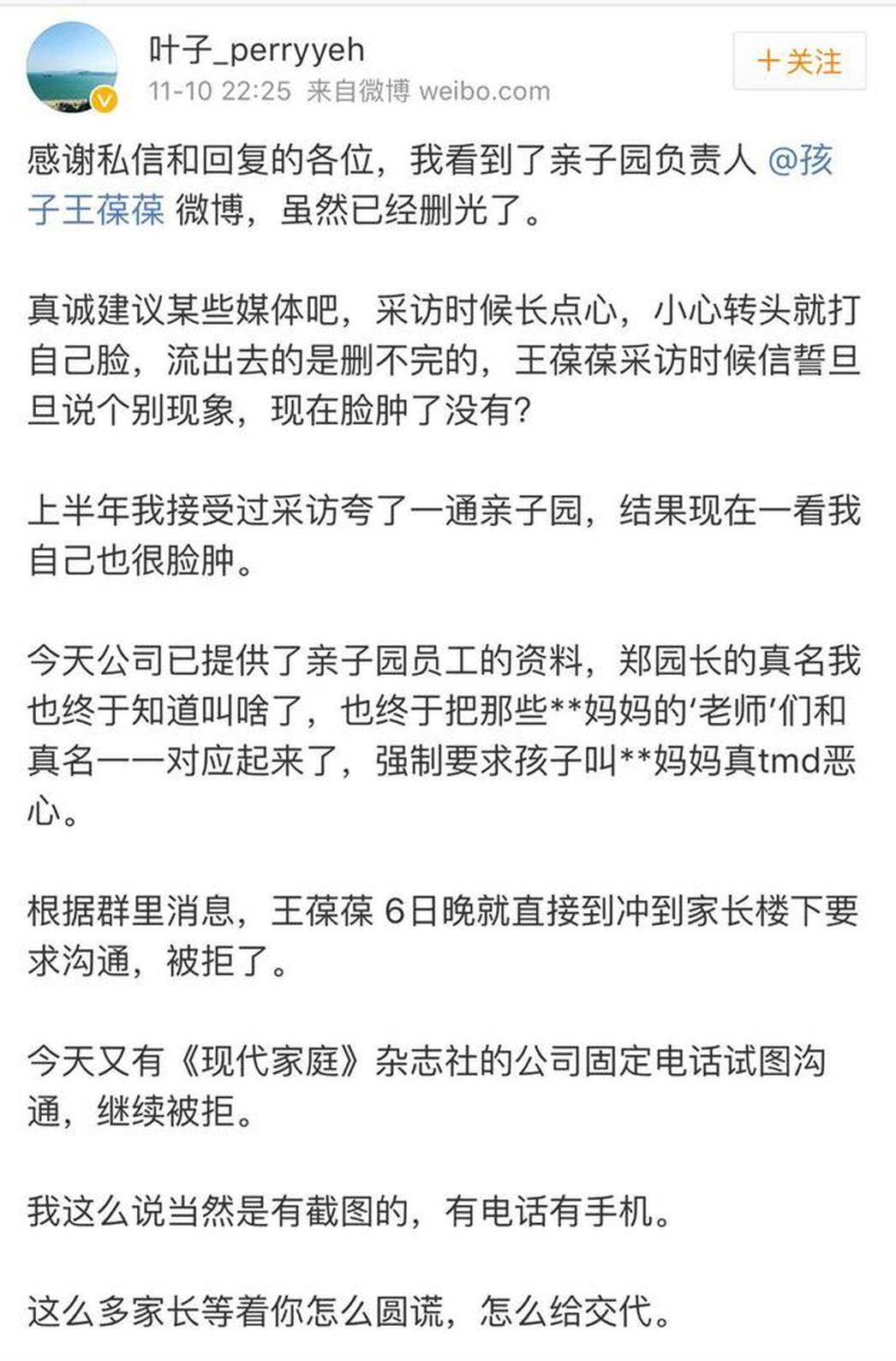 別的,該家長體現(xiàn),按照群里消息,王葆葆6 日晚就直接到?jīng)_到家長樓下要求溝通,被拒了,昨日又有《現(xiàn)代家庭》雜志社的公司固定電話試圖溝通,繼續(xù)被拒。“這么多家長等著你怎么圓謊,怎么給交代。順便,fu聯(lián)這是準備裝死了嗎?”