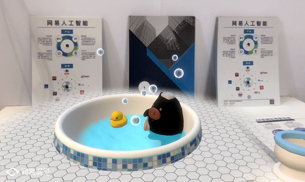 AR體驗:打開網(wǎng)易洞見app掃描展臺桌面,就可以通過屏幕看到,現(xiàn)場展臺桌面瞬間釀成了舞臺,“豬小花”出現(xiàn)在了“舞臺”上,并跳起了舞?,F(xiàn)場不雅觀眾被它“萌萌噠”形象逗樂了,并好奇其中的科技實現(xiàn)方式。