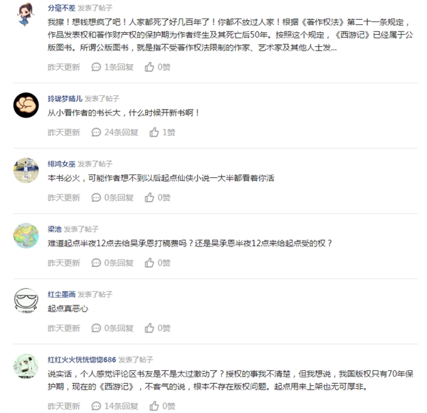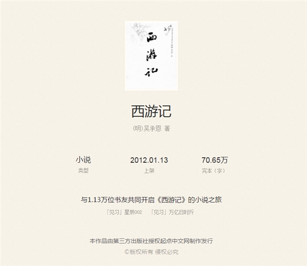 近日,起點中文網(wǎng)刊登的四大名著之一《西游記》引發(fā)網(wǎng)友熱議,官方竟自稱得到吳承恩的授權。有細心的網(wǎng)友發(fā)現(xiàn),在起點中文網(wǎng)《西游記》的正文頂部,寫著“本作品由(明)吳承恩授權起點中文網(wǎng)制作發(fā)行。按照歷史資料,,吳承恩(約 1500 年— 1583 年),已經(jīng)去世 430 多年了,這個授權有點“毛骨悚然”呀。